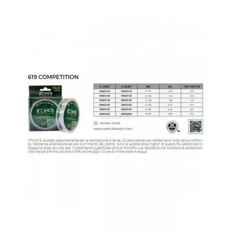 Il filo 619, studiato appositamente per la realizzazione di lenze,. Eccezionale tenuta, resistenza al nodo senza confronto,resistenza all’ abrasione ed allo scorrimento dei piombi, sono le caratteristiche migliori di questo filo selezionato in Giappone dopo accurati test. Il trattamento superficiale dona al monofilo una resistenza che mantiene le caratterisitiche meccaniche fino ad oltre il 95% anche dopo 10 ore di immersione in acqua.