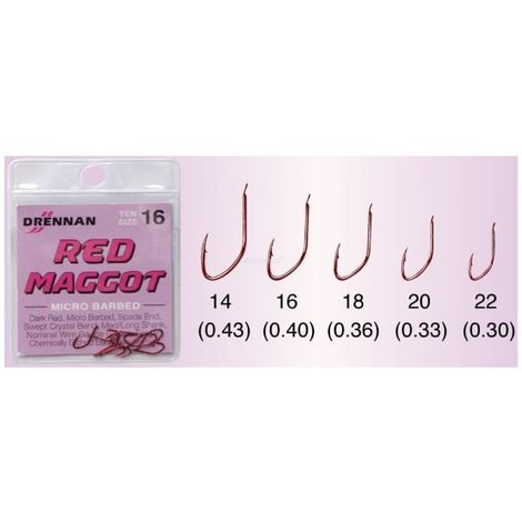 Amo Drennan Micro Barbed Red Maggot l'amo drennan micro barbed red maggot è un amo rosso con micro ardiglione con gambo medio lungo. punta affilata chimicamente. Disponibile in diverse misure , in blister da 10 ami.