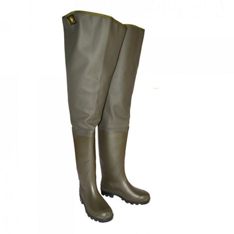 Affidabile stivale a tutta coscia modello Impronta. Realizzato in una miscela resistente di gomma e cordura, che lo rende totalmente impermeabile. Al suo interno è foderato in cotone (nella sola sezione dello stivale al ginocchio). La parte superiore che parte dallo stivale fino all'anca è in pratico PVC.