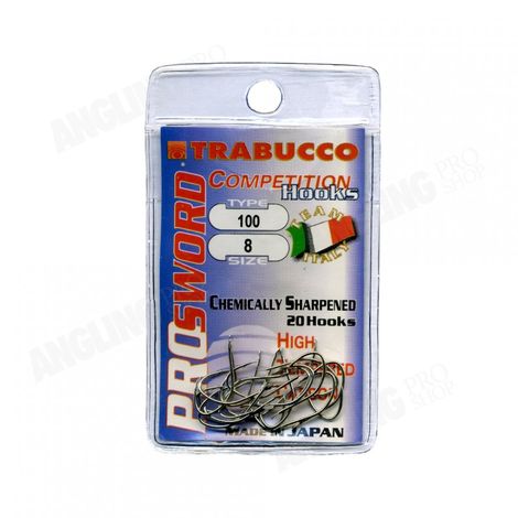Trabucco PRO SWORD 100 è un gancio finitura nichel con curva speciale, gambo medio sottile con micro ardiglione, punta leggermente rivolta all'interno, affilato chimicamente. È l'amo più forte, specifico per la cattura frequente e continua di pesci grossi.